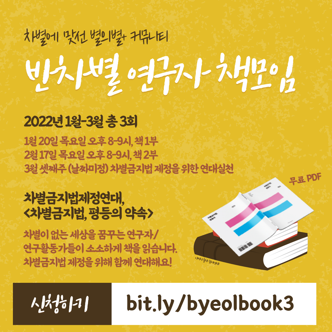 차별이 없는 세상을 꿈꾸는 연구자/연구활동가들이 함께 모여 소소하게 책을 읽고 있습니다. 차별 관련 책을 읽고 자신의 연구/활동/삶과 연결지어 생각을 나누는 민주적 배움의 공동체를 만들어가는 중입니다. 차별금지법에 대해 더 알아가고 싶은 분, 연구활동가로서 차별금지법 이슈에 대해 공부하고 실천하고 싶은 분들, 차별금지법 제정을 위해 목소리를 모으고 싶은 분들 모두 환영합니다.