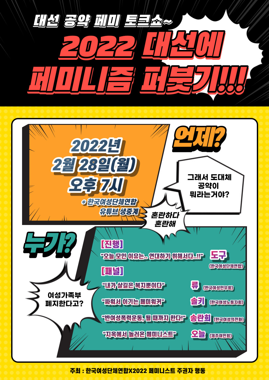 여성연합 유튜브 생중계를 통해 <대선 공약 페미 토크쇼 – 2022 대선에 페미니즘 퍼붓기!!!>를 개최합니다.