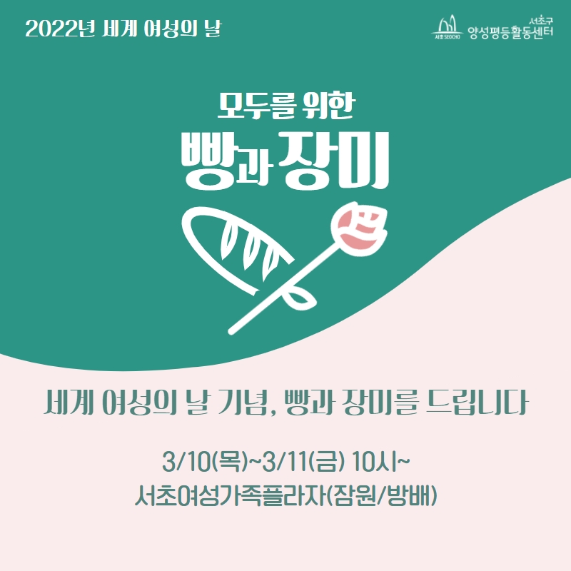 서초구양성평등활동센터에서는 세계 여성의 날을 기념하여 함께 빵과 장미를 나누며 평등과 인권의 의미를 되새기고자 캠페인을 진행합니다.