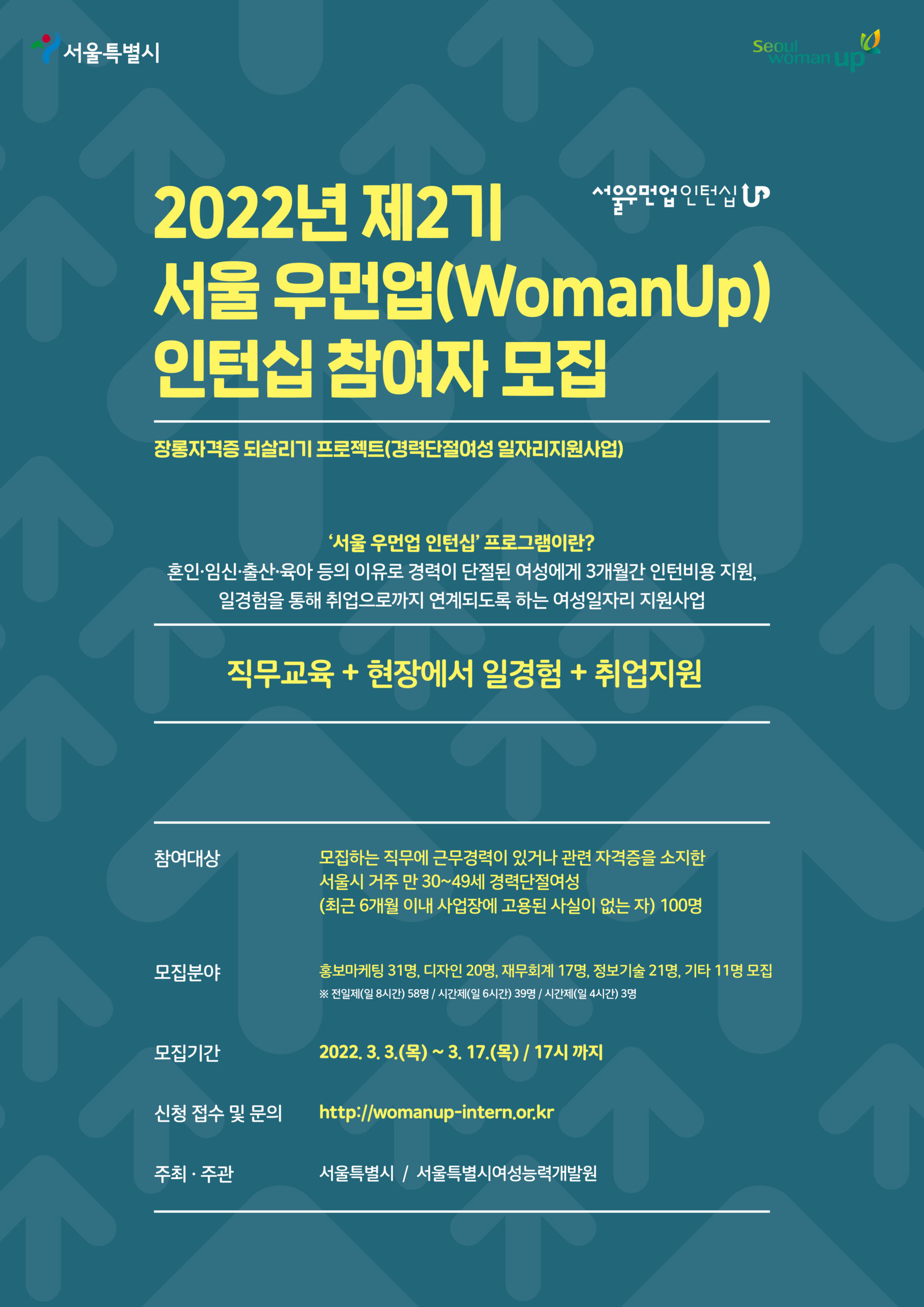※ 지원은 서울 우먼업 인턴십 참여신청 사이트(womanup-intern.or.kr)에서만 가능