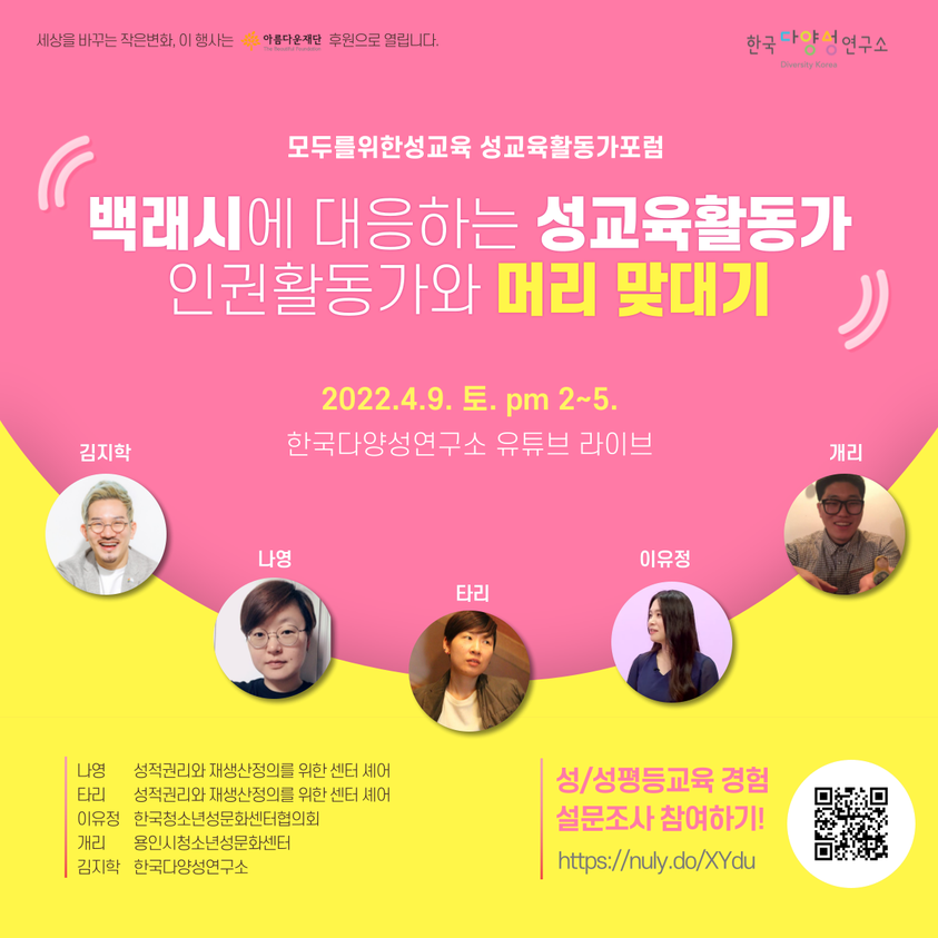 한국다양성연구소에서 주최하는 ‘성교육 활동가를 위한 모두를 위한 성교육 포럼’에 셰어의 나영 대표와 타리 기획운영위원이 참여합니다. 성교육에 관심있는 누구나 참여할 수 있는 포럼입니다. 오는 4월 9일 토요일, 한국다양성연구소 유튜브 채널에서 오후 2-5시 세 시간 동안 라이브로 진행됩니다.