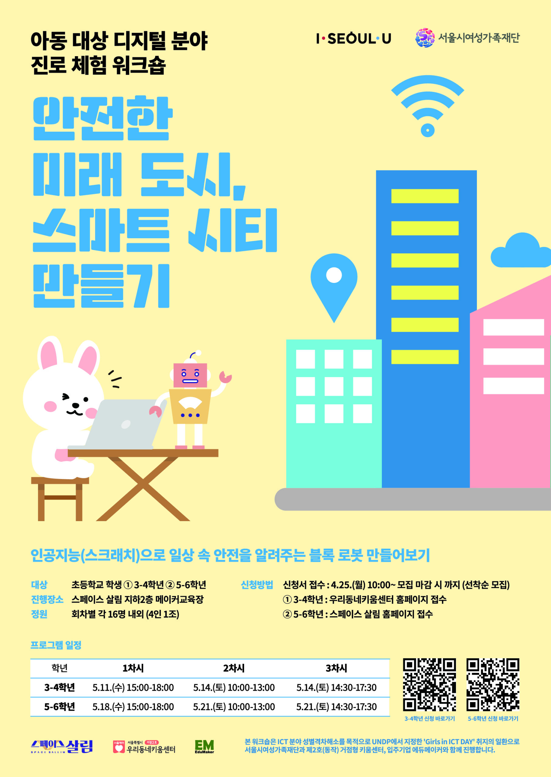 – 본 워크숍은 ICT 분야 성별격차해소를 목적으로 UNDP에서 지정한 ‘Girls in ICT DAY’ 취지의 일환으로 서울시여성가족재단, 제2호(동작) 거점형 키움센터, 입주기업 에듀메이커가 함께합니다.