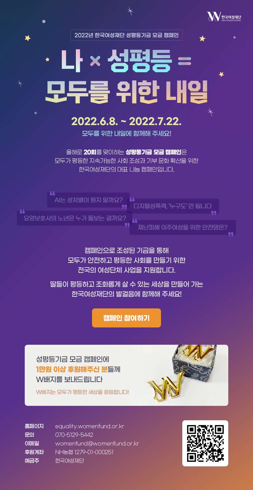 올해로 20회를 맞이하는 성평등기금 모금 캠페인은 모두가 평등한 지속가능한 사회 조성과 기부 문화 확산을 위한 한국여성재단의 대표 나눔 캠페인입니다.