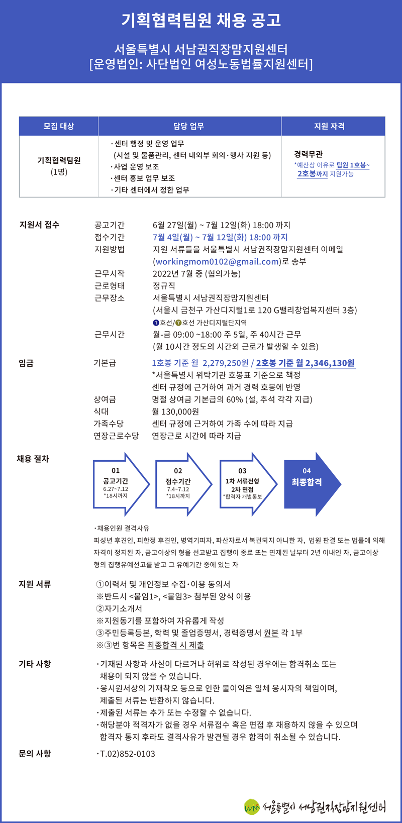 [서울특별시 서남권직장맘지원센터] 기획협력팀원 채용 안내(~7/12)