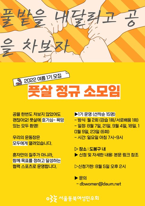 ⚽ 지난 여름 동안 뜨거웠던 민우풋살 원데이 소식 들으셨나요? 드디어 정규 구성원을 모집합니다. 여름동안 팀원으로 모여서 함께 배우며 운동장을 뛰어보아요!
