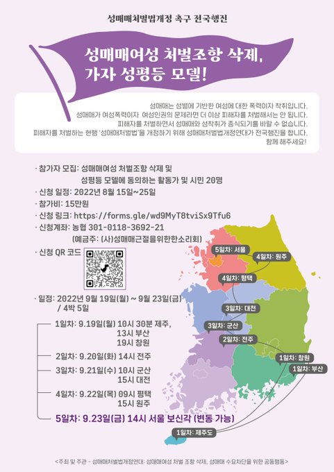 신청대상: 성매매여성 처벌조항 삭제 및 성평등 모델을 원하는 활동가 및 시민 20명