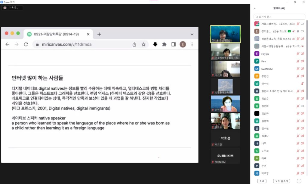 첫 강의는 정의솔 선생님의 강의로 인터넷 공간에서 대중 페미니즘의 흐름에 대해 살펴보았습니다. 트롤링, 밈 문화가 무엇인지, 인터넷 공간 안에서 페미니즘 운동의 동력이 된 이러한 흐름은 왜 생겨났고 의의는 무엇인지에 대해 다루며 다양한 세대의 참여자들의 대중페미니즘에 대한 이해를 도왔습니다.