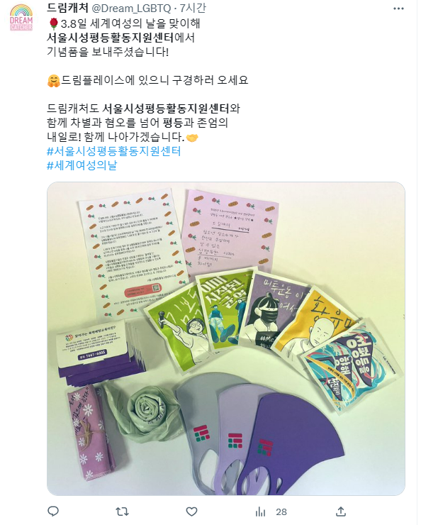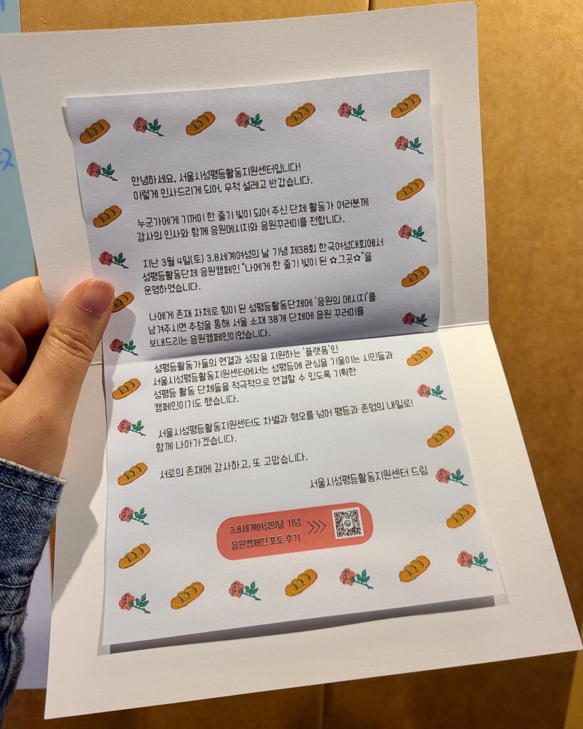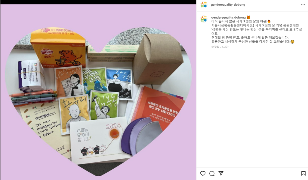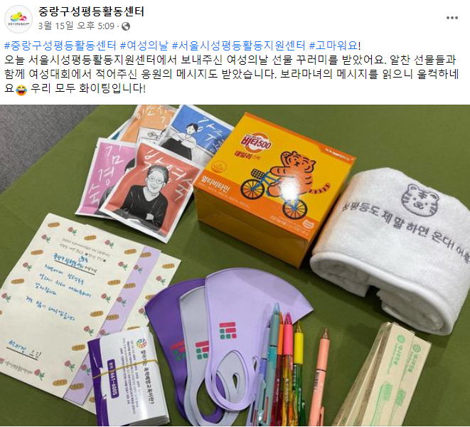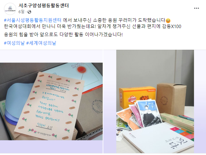 3월 8일 세계여성의 날이 있는 주간에 열심히 작업하여 보낸, 응원꾸러미가 성평등활동단체에 도착하면서 저희 기관에게 피드백을 보내주셨어요. 감사합니다😍