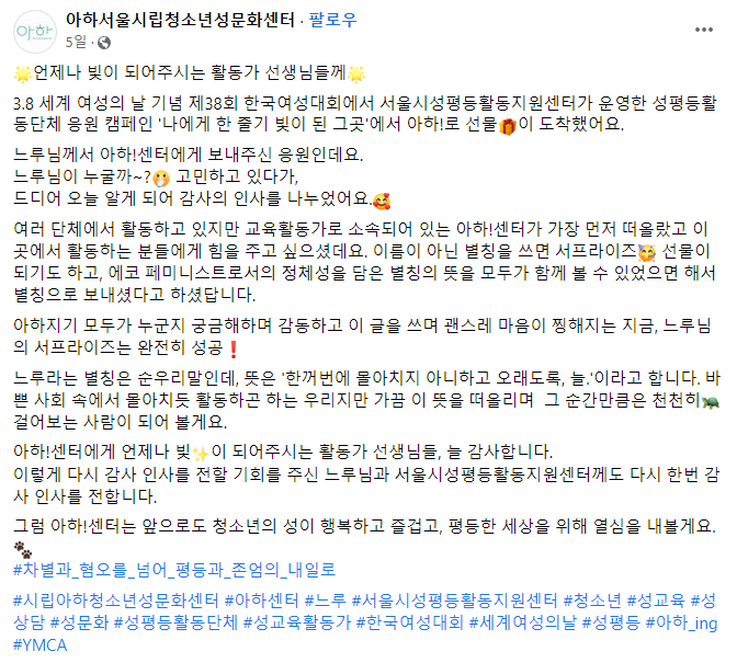 나에게 한줄기 빛이 된 ‘성평등활동단체’에 응원메세지를 남겨주시면, 서울시성평등활동지원센터가 응원꾸러미를 대신 전달해 드리는 응원이벤트였는데요.