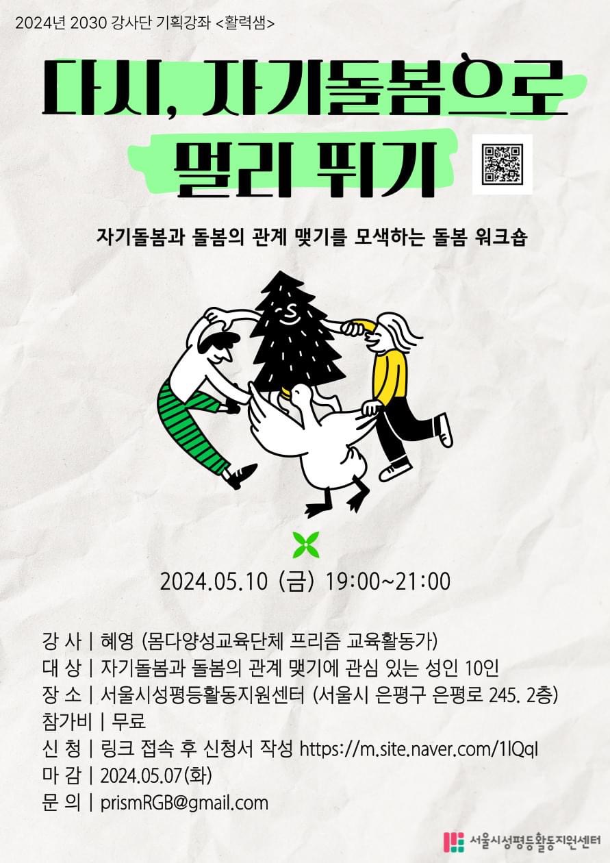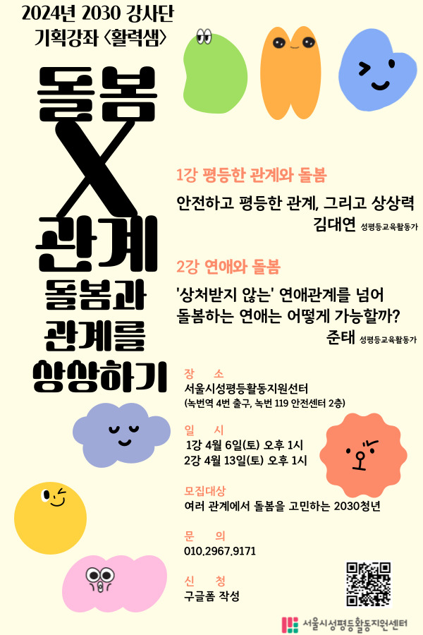 올해도 성평등터 2030 강사단들이 야심차게 준비한 다양한 성평등 ‘돌봄’과 관련된 강좌들을 만나보세요!