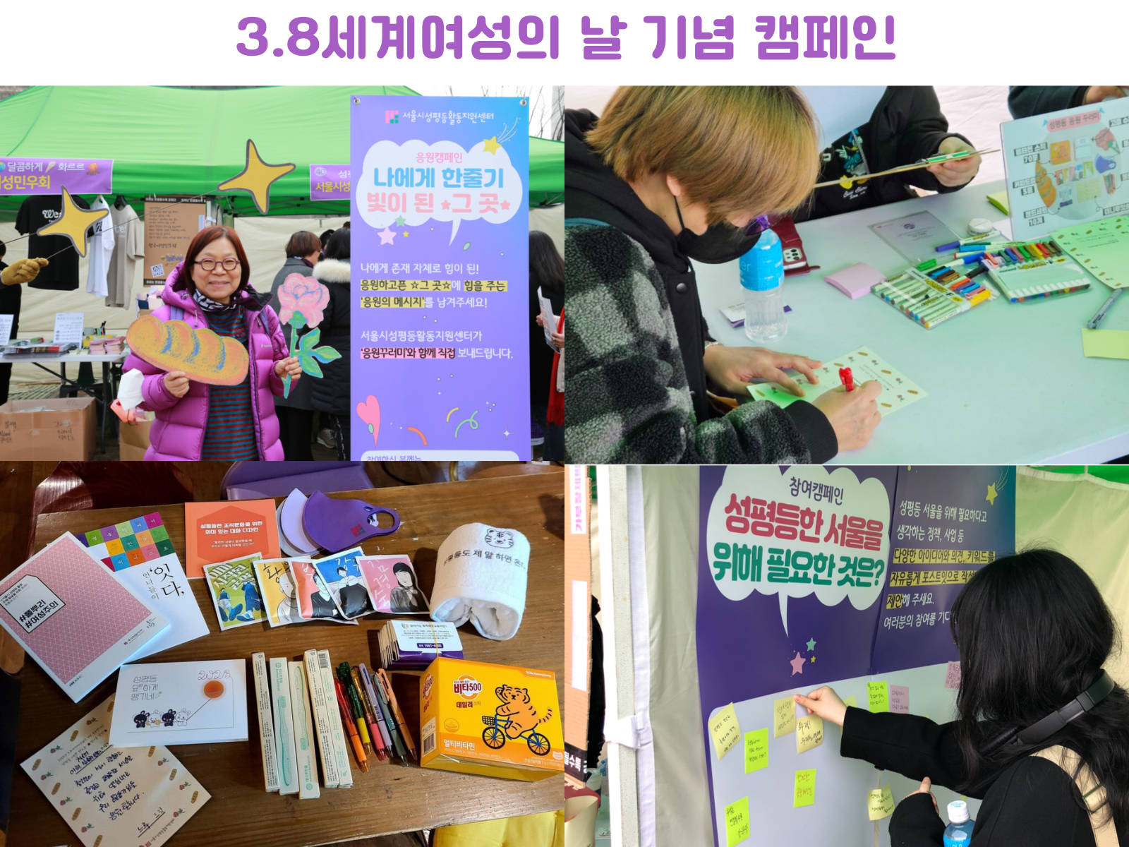 나에게 존재 자체로 힘이 된 성평등활동단체에게 응원메세지를 전달하는 캠페인 <나에게 한줄이 빛이 된 그곳>과 성평등 서울을 위해 필요하다고 생각하는 정책, 사업 등 다양한 아이디어를 모으는 캠페인 <성평등한 서울을 위해 필요한 것은>을 열었습니다.