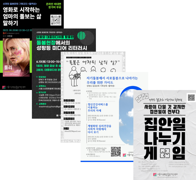 기획강좌 <활력샘>을 통해 2030 성평등교육활동가들이 긍정적인 강의경험을 쌓을 수 있도록 지원했고 올해에는 ‘성평등한 돌봄문화’를 주제로 양육자대상 기획강좌 “영화로 시작하는 엄마의 돌보는 삶”, “돌봄현장에서의 성평등 미디어 리터러시”, “돌봄은 어차피 남의 일”. “자기돌봄에서 서로돌봄으로 나아가는 우리를 위한 가이드”, “집안 일 나누기 게임”이 진행되었습니다.