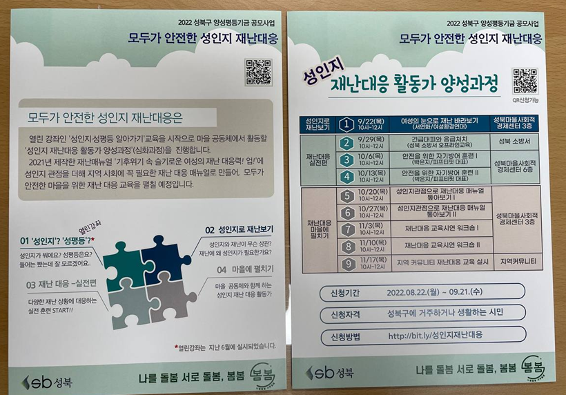 – 그리고 저희가 활동하고 있는 단체 ‘봄봄’에서 작년에 이어 올해도 성북구 양성평등 기금 공모사업에 선정되어 성인지 관점으로 재난대응 활동가 양성 과정을 진행하려고 해요.