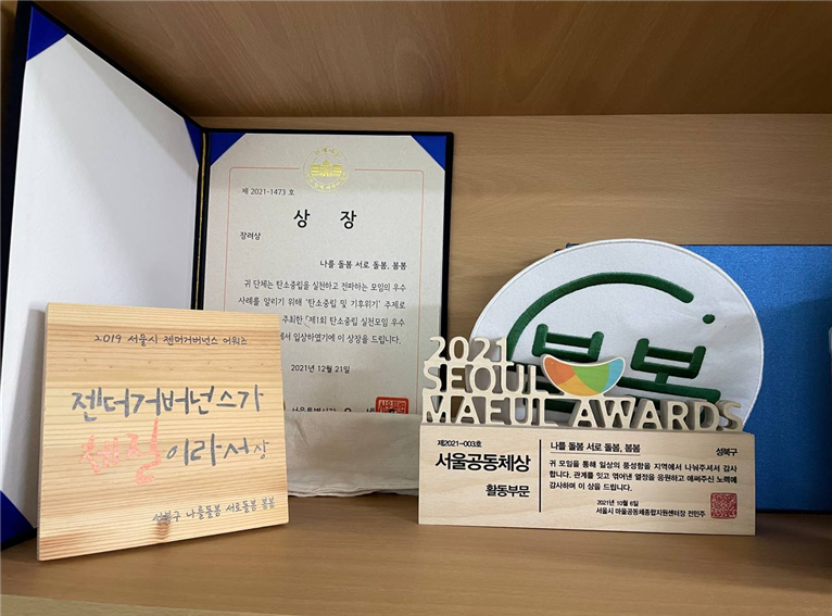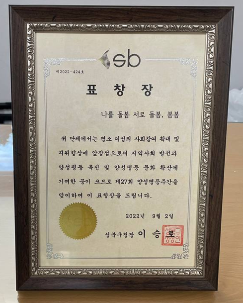 – 지난 9월 성북구 성평등 기념주간에 저희가 표창장을 수상했어요. 성북구에서 성평등에 기여한 단체 및 개인에게 주는 상으로 그동안 저희가 해온 활동을 인정받아 이렇게 상을 받게 되었어요. 시상식에서 꽃다발 대신 피켓을 들고 기념촬영을 하고 수상소감으로 ‘성북에도 성평등활동센터가 필요하다’라고 말했어요. 한국의 성평등은 이미 다 이루어진 것 아니냐고 말하시는 분들도 계신데, 정책을 만들고 실행하는 분들의 성인지감수성이 더 높아질 수 있도록 성평등 교육이 절실하다는 생각을 했어요. 그래서 성북에 더욱더 성평등활동센터가 필요하다고 생각하고요.