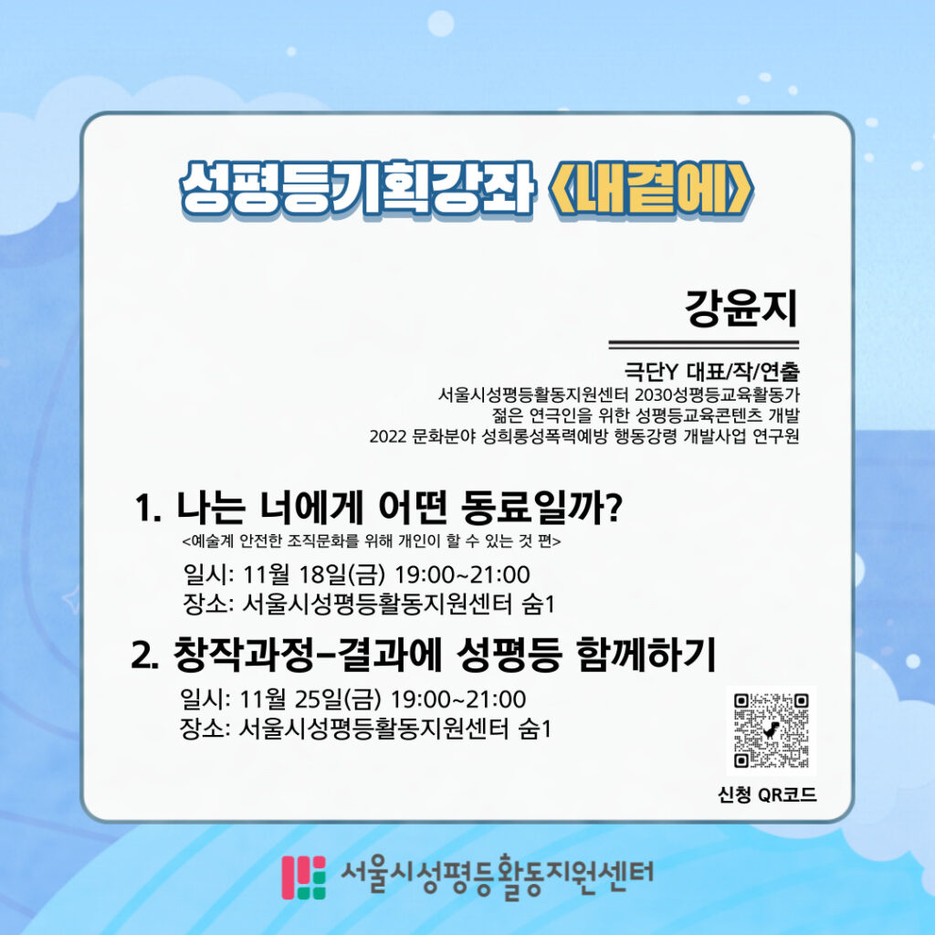 오는 11월에 2030 성평등교육활동가들이 직접 기획하고 강의하는 ‘성평등 기획강좌 <내곁에>를 통해 만나실 수 있습니다.